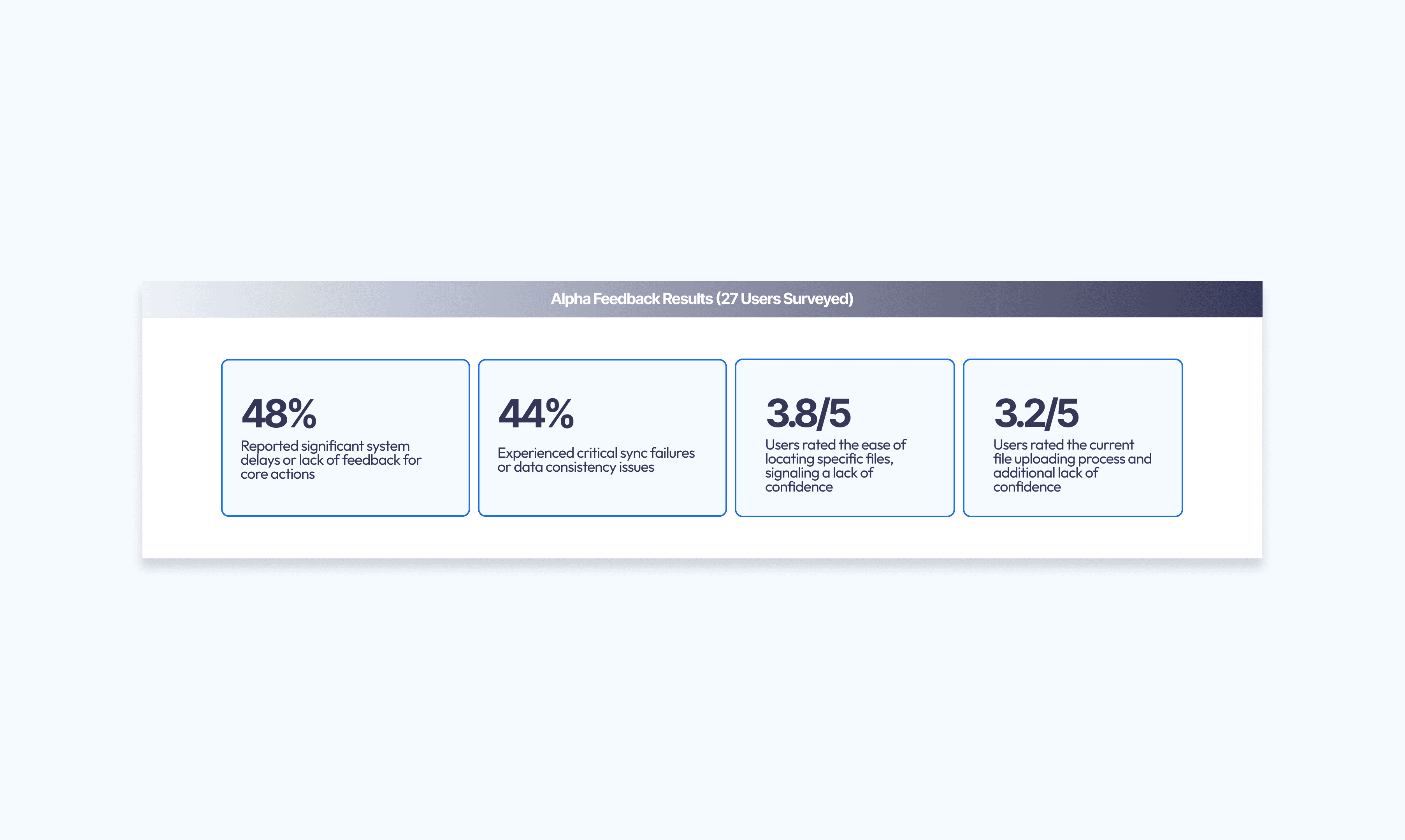 The Alpha Feedback Report delivered a wake-up call. Out of 27 testers, nearly half reported significant delays and lack of feedback for core actions like uploading or moving files. Users weren't just annoyed—they were unsure if their work was even being saved.