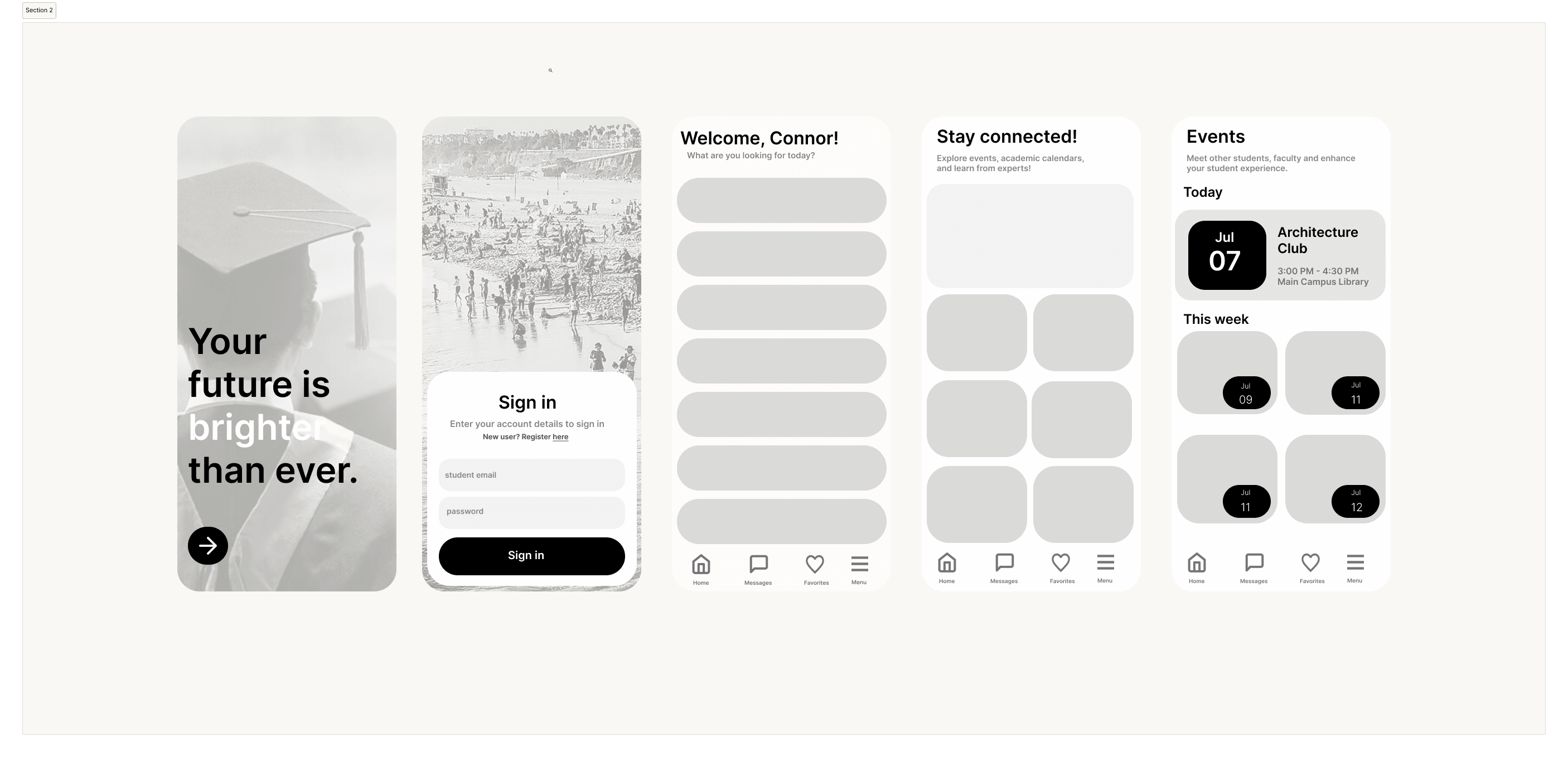 With research in hand, the challenge became turning student frustrations into tangible design opportunities. I began sketching early concepts to explore how a centralized hub could feel approachable, modern, and intuitive. The goal was to make navigating campus life feel less like searching for a needle in a haystack and more like opening a clear, welcoming map.