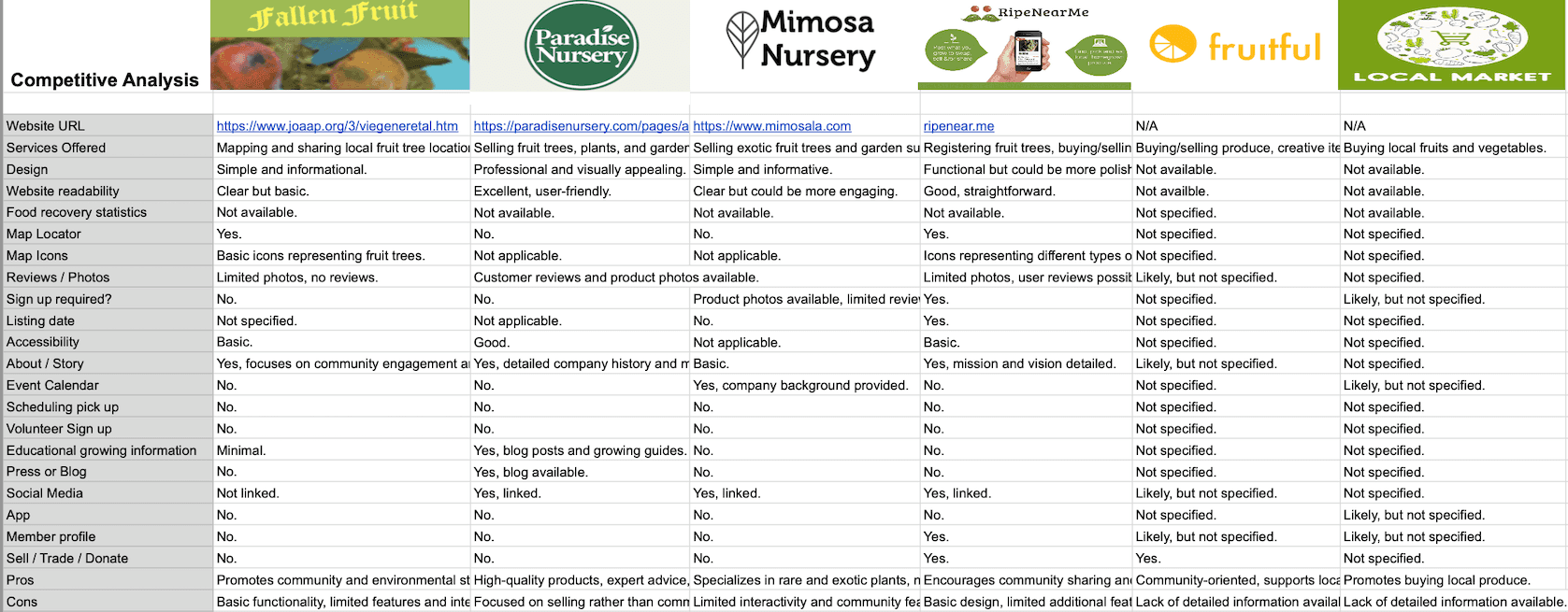Next, I ran a competitive analysis to compare direct competitors like Fallen Fruit and RipeNearMe with indirect competitors such as food rescue and sustainability apps. Some offered strengths like basic maps or community-sharing functions, but most lacked modern design systems, strong community features, or accessibility considerations. From this, I saw a clear opportunity: Fruity needed to stand out by being community-focused, visually simple, and easy to navigate.